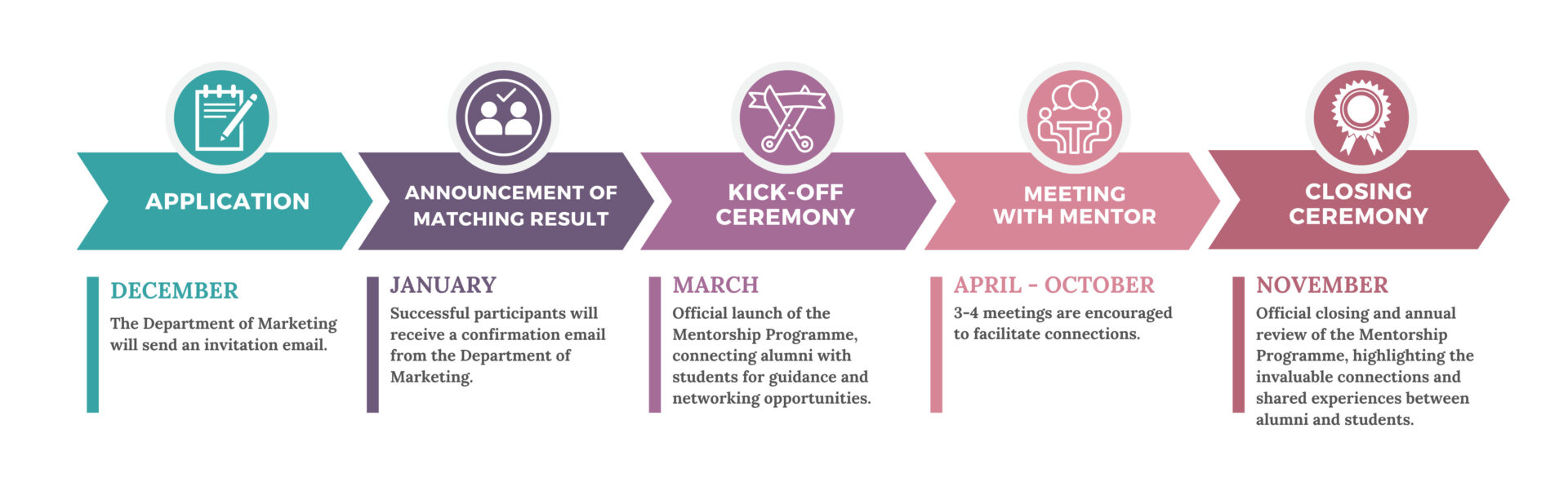 市場學系校友師友計劃旨在讓修讀市場學與綜合工商管理課程的學生,與來自市場學系的資深校友建立連繫。此計劃為學生提供一個寶貴平台,從中獲取學術及事業發展建議,並建立深厚的人際關係和拓展專業網絡。透過一對一或小組互動(盡量安排每位導師指導兩位學員),學生可從已成功走過相似道路的畢業生身上,汲取寶貴的經驗與建議。計劃不僅促進學生的個人與專業發展,亦進一步加強市場學系的凝聚力與歸屬感。